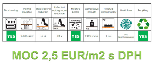 Redukcia krokového hluku: min. 18 dB Tepelný odpor : max. 0,035 m2K/W